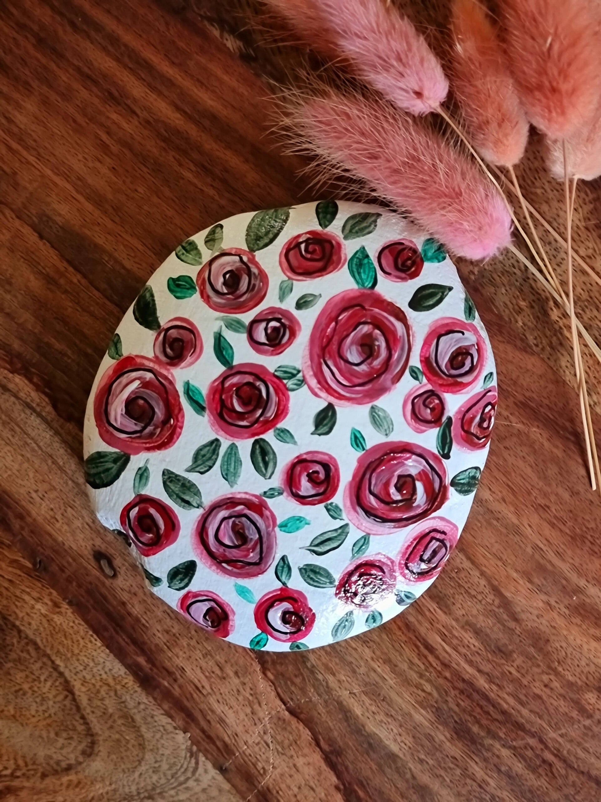 Laissez-vous séduire par l’élégance et la délicatesse de ce galet peint à la main, intitulé "Éclosion de Roses".