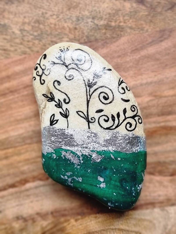 Ce galet unique peint recto verso révèle des arabesques libres et organiques, évoquant la nature et le mouvement.