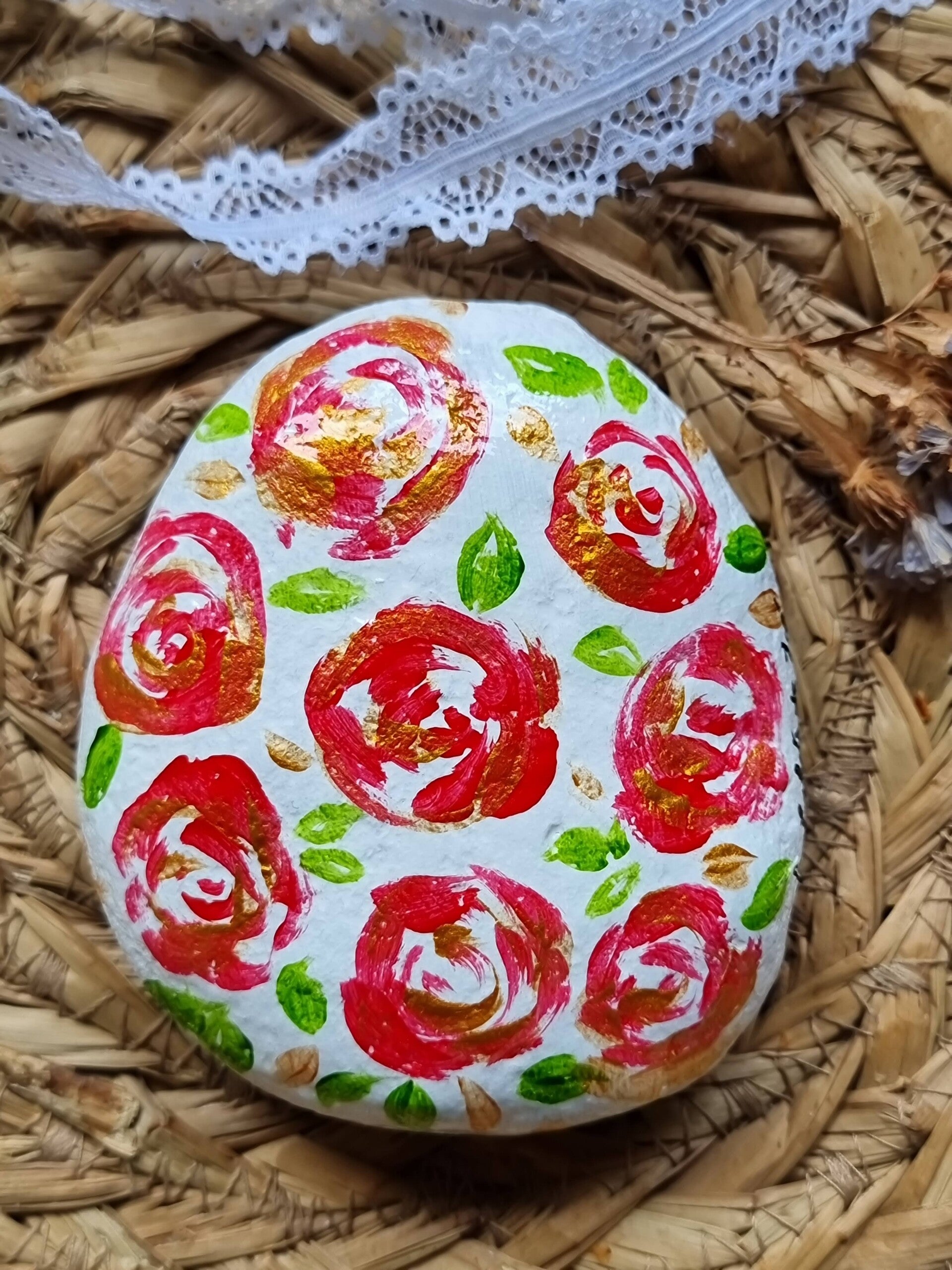Ce galet unique peint à la main révèle la beauté brute de roses rouges audacieuses, sublimées par des éclats dorés lumineux. Protégé par trois couches de vernis glossy, il brille comme un bijou de nature.