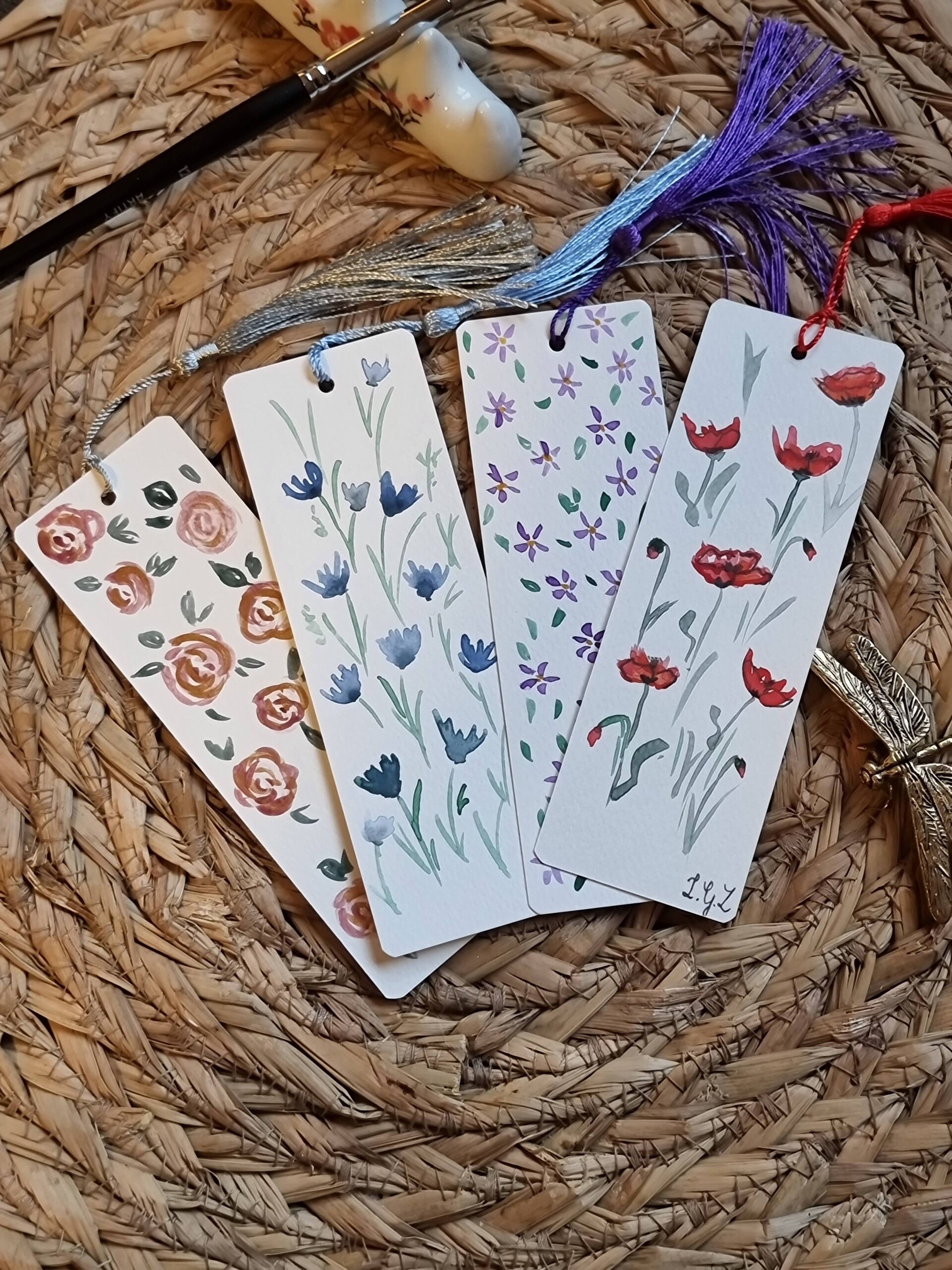 Ces quatre marque-pages, réalisés sur du papier aquarelle coton 300 grains, sont ornés de motifs floraux peints à la main, évoquant la fraîcheur et la beauté du printemps.