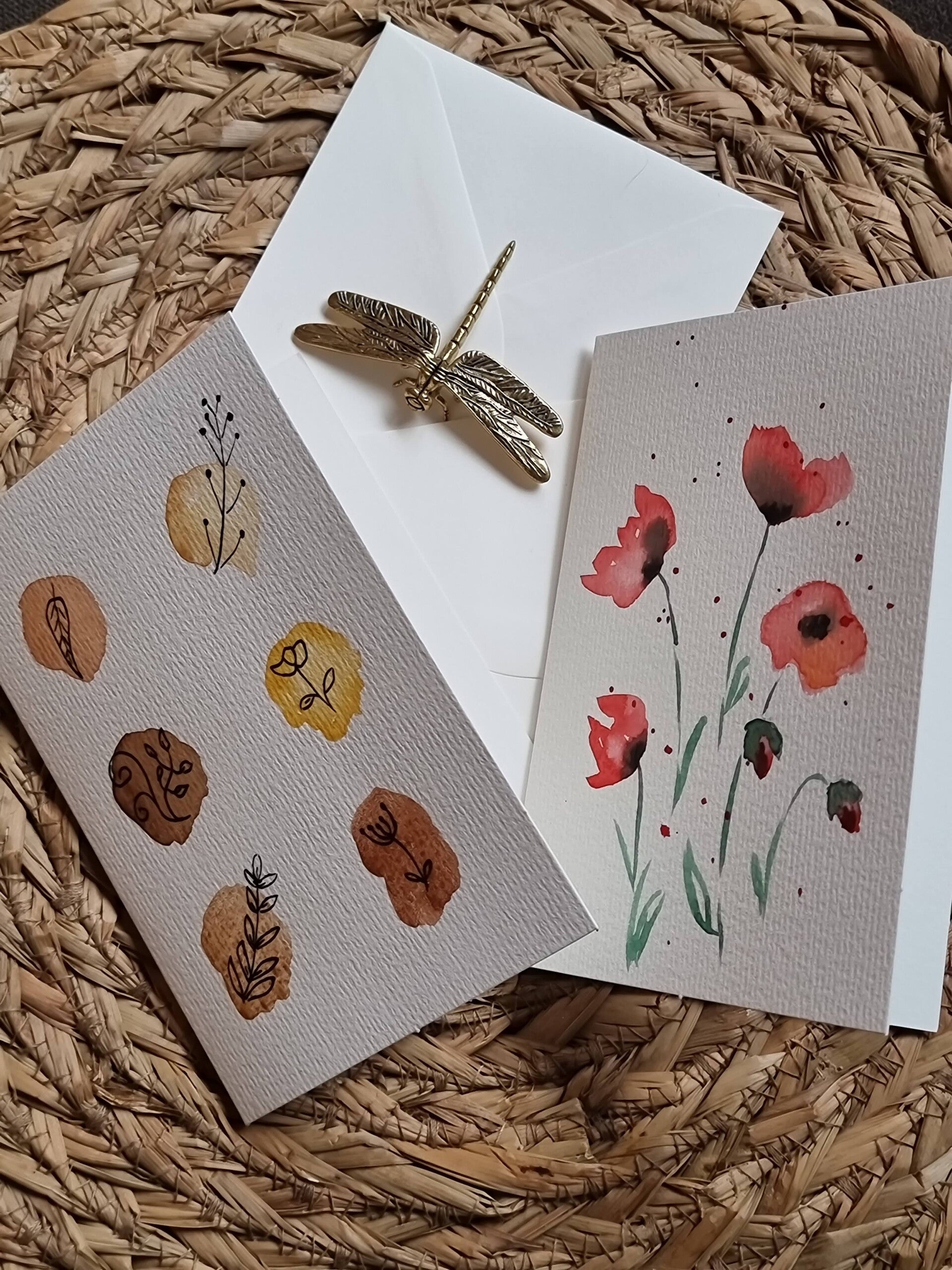 Lot de 2 cartes pliables avec ses 2 enveloppes.Aquarelle sur papier 100 % coton - Dimensions 10X15 - 25 grLivraison gratuite.