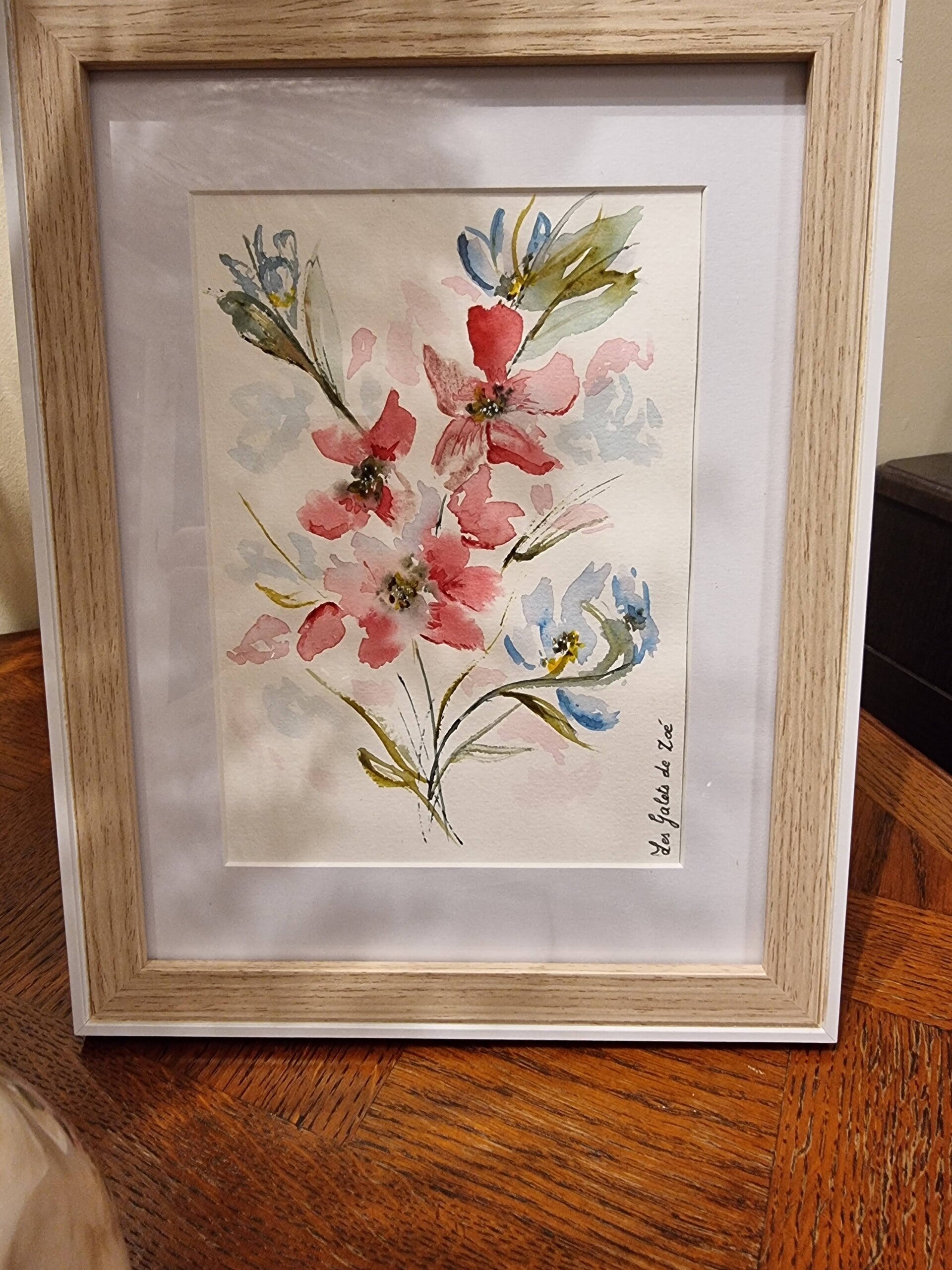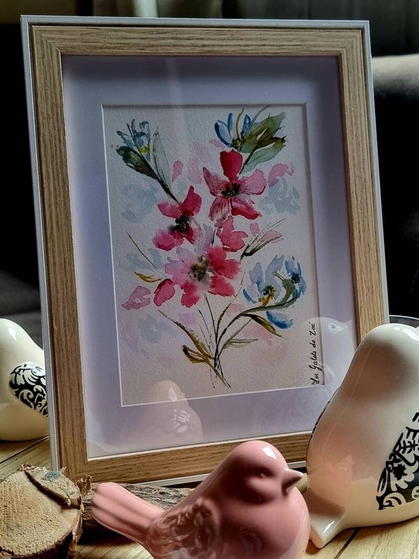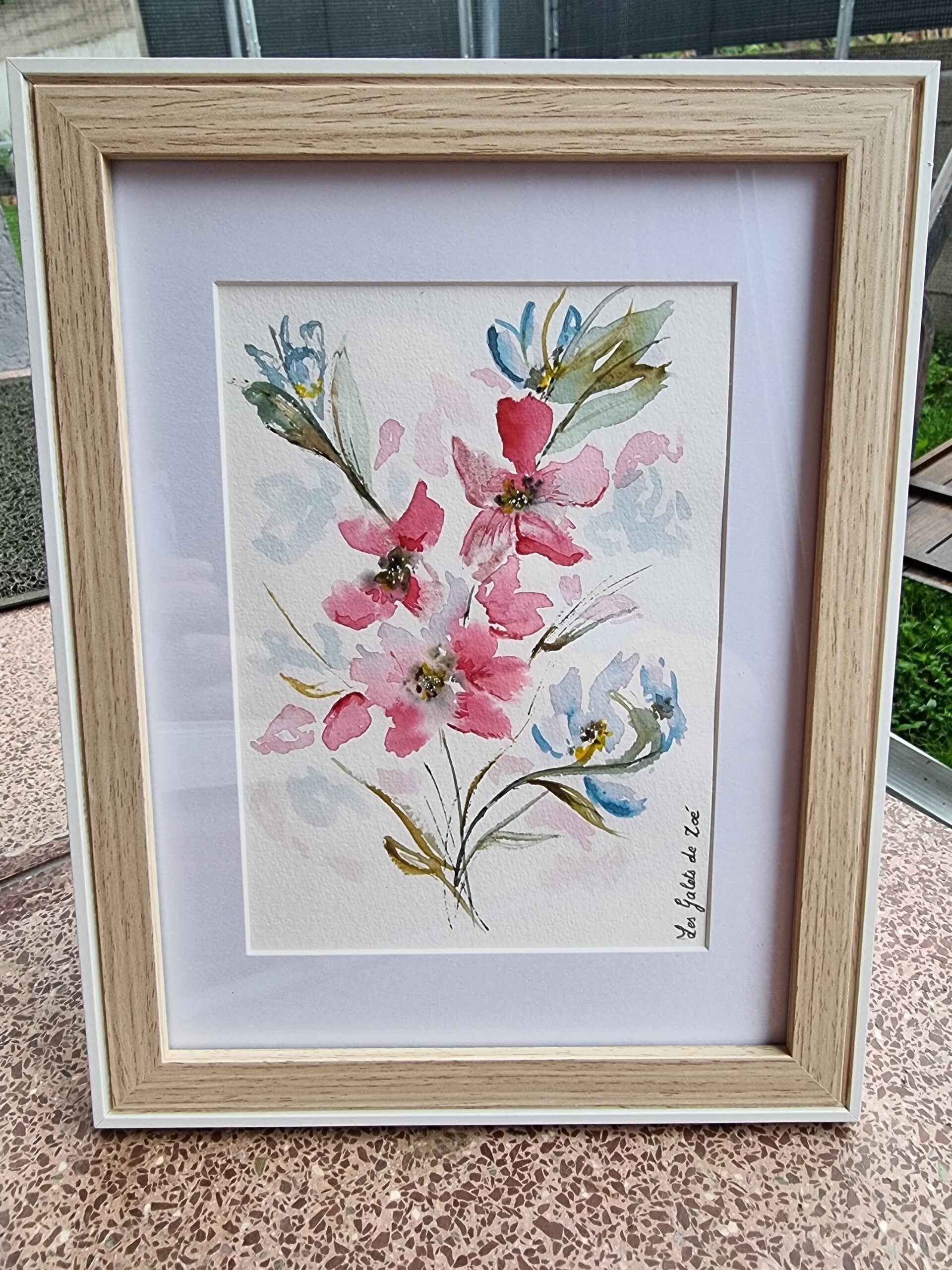 Un bouquet léger, où le rose tendre rencontre le bleu doux, éclot comme une promesse de beaux jours. On y devine la caresse d’un vent tiède et la lumière claire des matins printaniers du jardin, quand chaque fleur semblait sourire au ciel.
