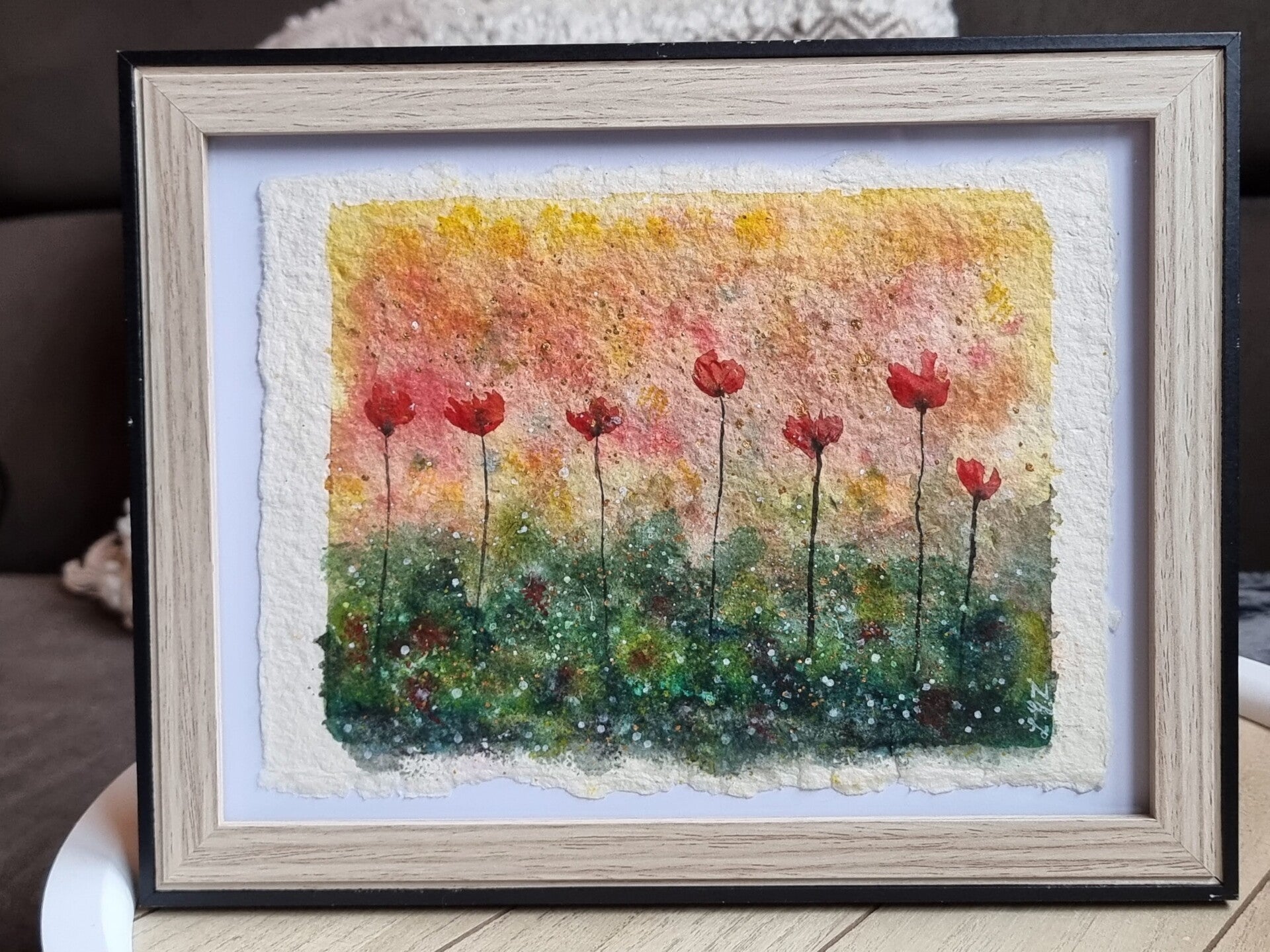 Les coquelicots rouges s’élèvent délicatement sur un fond aux teintes chaudes, un mélange de jaune, d’orange et de rose, rappelant la douceur d’une fin de journée estivale.